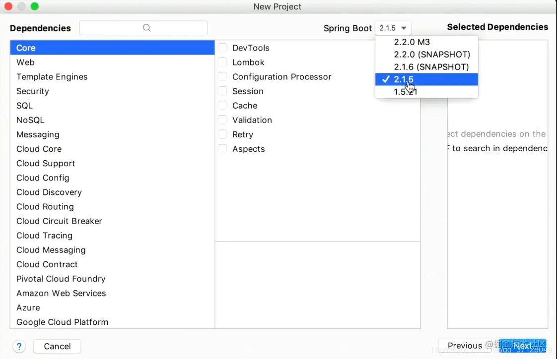 - 选择需要的依赖,同时选择SpringBoot版本,其中如图所示的,除了2.1.5外,上方的都不是正式版,所以我们选择版本为2.1.5,如图所示: