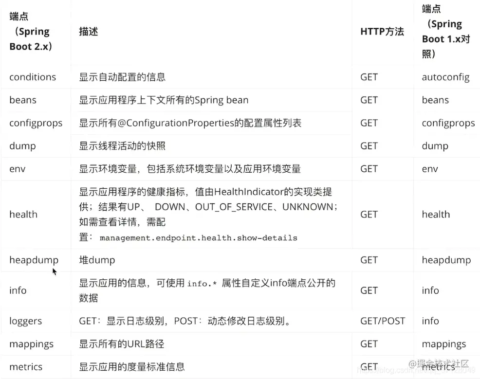 - 提供的监控端点如图(此处列的是常用的,可以去官方文档查看全部的):