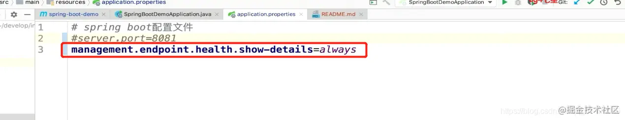 我们在application.yml中配置,让健康检查更加详细: management.endpoint.health.show-details=always 复制代码