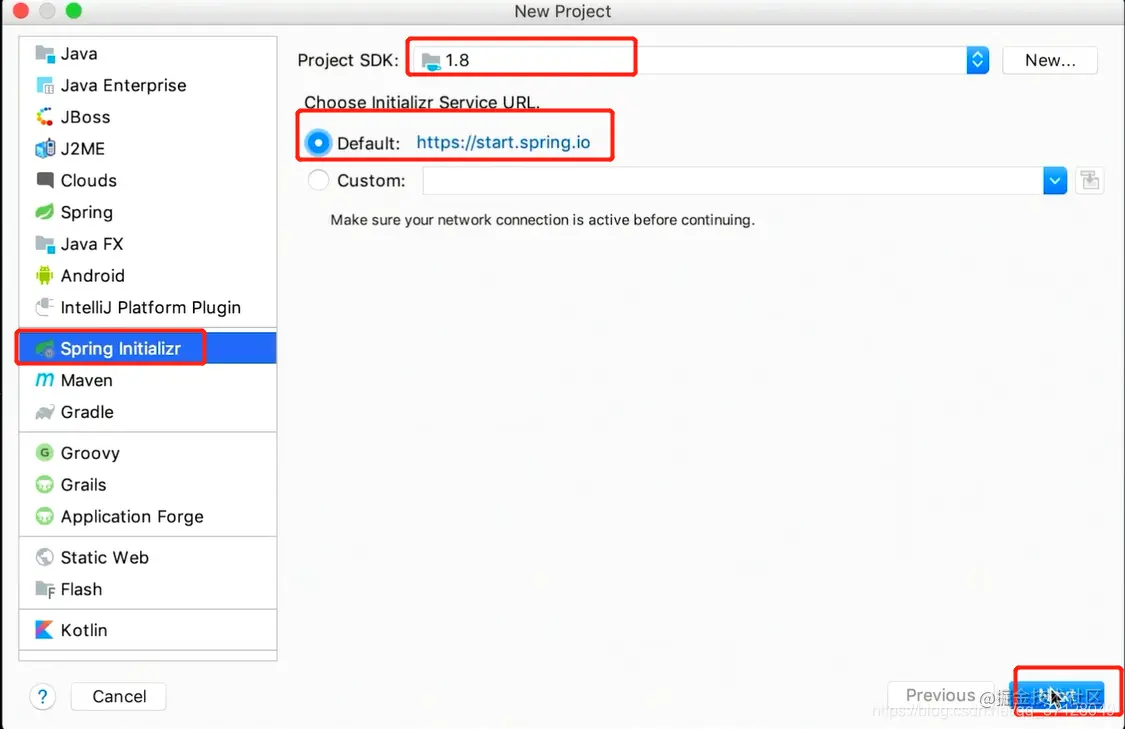 - 点击Create New Project -> Spring Initializr -> 配置JDK-> 选择Default-> 点击Next,如图所示: