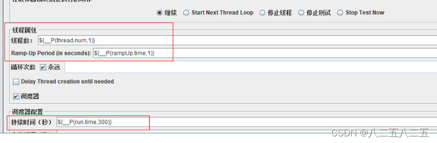 修改脚本中的线程数为${__P(thread.num,1)},Ramp-Up Period(in seenconds)为${__P(rampUp.time,1)},调度器配置中持续时间为${__P(run.time,300)}