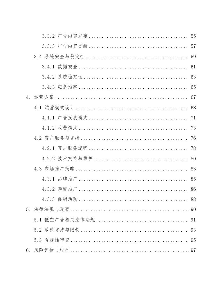 确保系统安全性:低空广告系统将严格遵守相关法律法规,确保飞行器的安全操作和广告内容的合规性。系统将配备多重安全机制,包括飞行路径规划、实时监控和应急响应系统,以应对突发情况。