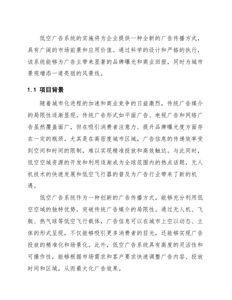 通过以上范围的定义,本项目将确保低空广告系统从设计到运营的每个环节都得到充分的考虑和实施,最终实现一套高效、安全、可靠的广告展示系统。
