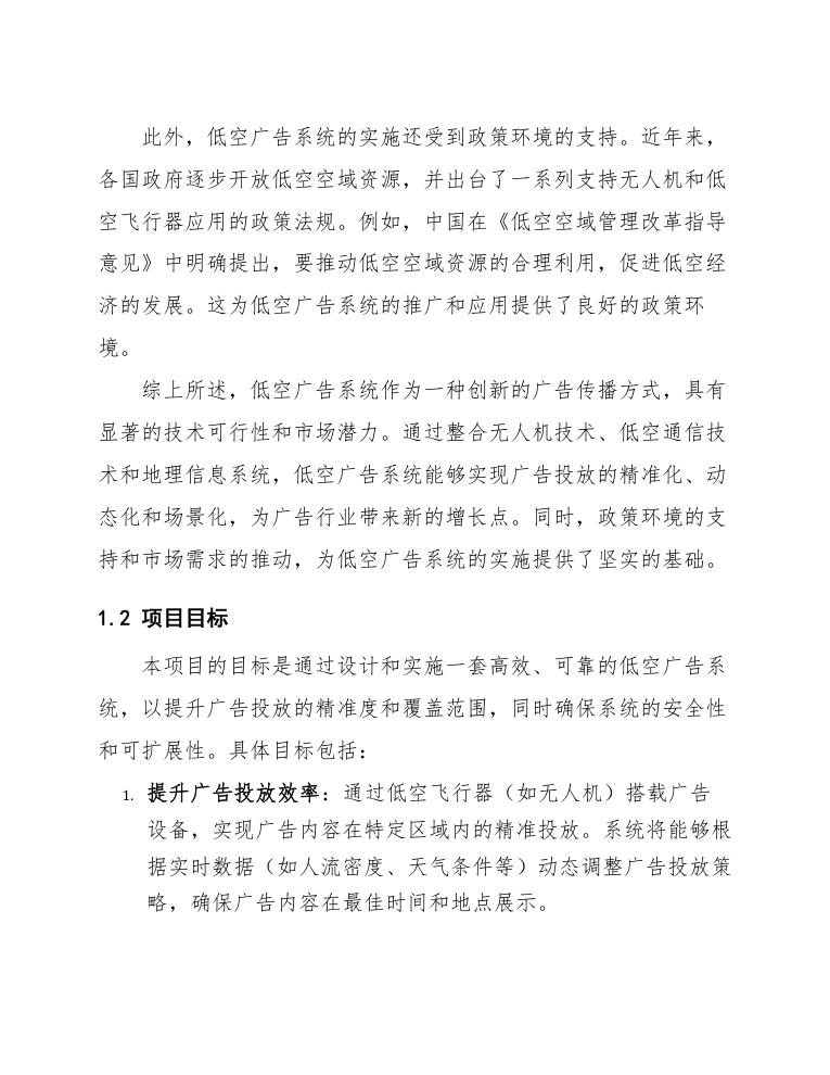 本项目的目标是通过设计和实施一套高效、可靠的低空广告系统,以提升广告投放的精准度和覆盖范围,同时确保系统的安全性和可扩展性。具体目标包括: