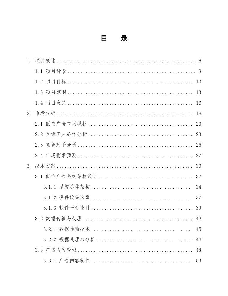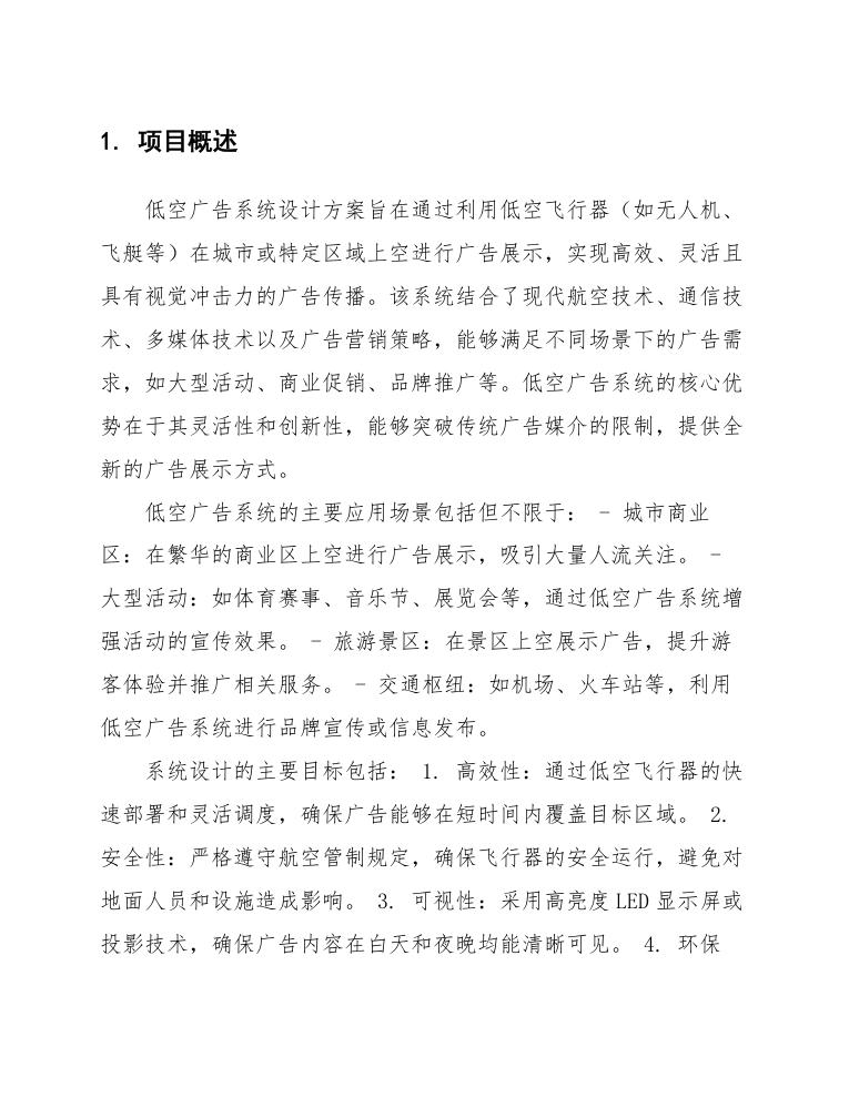本项目旨在设计并实施一套低空广告系统,该系统将利用无人机、飞艇或其他低空飞行器在城市或特定区域进行广告展示。项目范围涵盖从系统设计、设备选型、软件开发、测试部署到运营维护的全生命周期管理。具体包括以下几个方面: