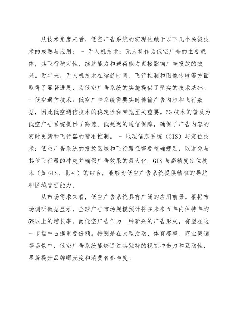 综上所述,低空广告系统作为一种创新的广告传播方式,具有显著的技术可行性和市场潜力。通过整合无人机技术、低空通信技术和地理信息系统,低空广告系统能够实现广告投放的精准化、动态化和场景化,为广告行业带来新的增长点。同时,政策环境的支持和市场需求的推动,为低空广告系统的实施提供了坚实的基础。