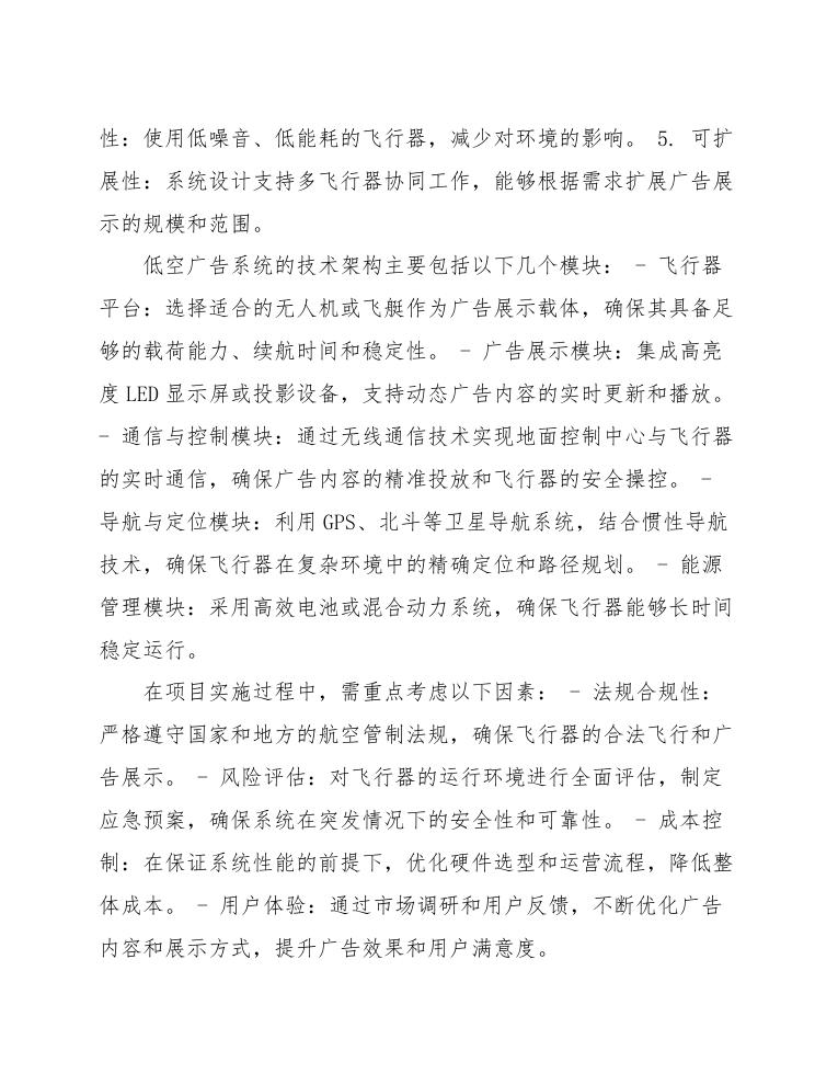 综上所述,低空广告系统的设计与实施,不仅能够填补传统广告媒介的空白,提升广告传播的灵活性和实时性,还具有较高的经济效益和社会效益。同时,其实施将推动相关产业的发展,促进城市广告传播和公共信息传递的现代化进程。
