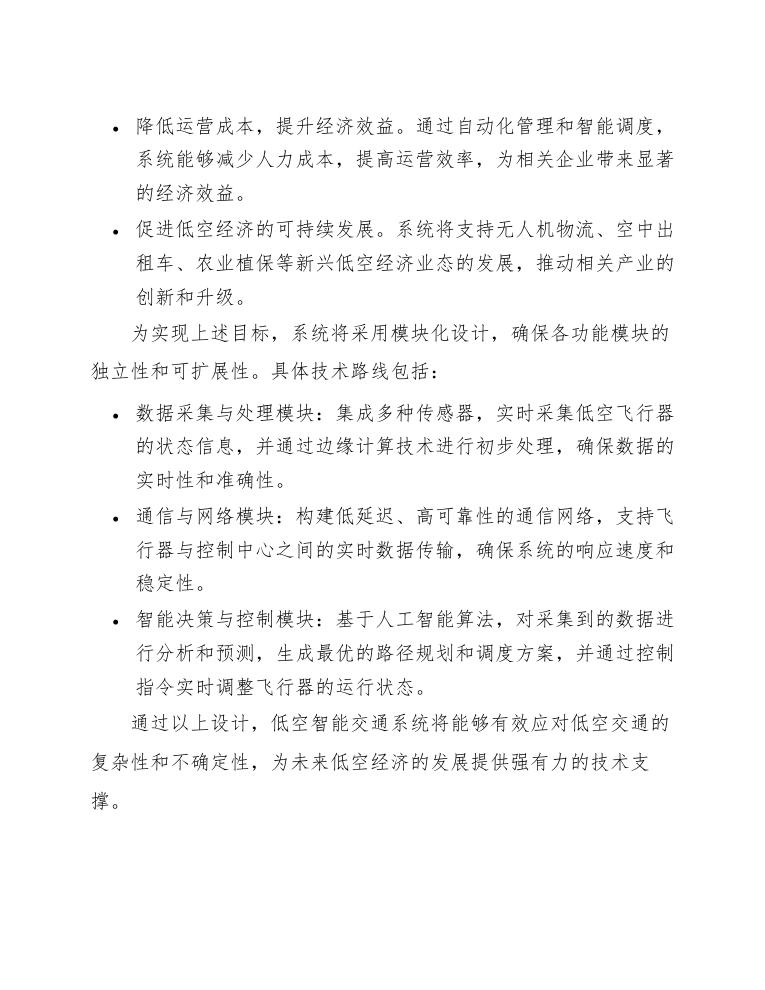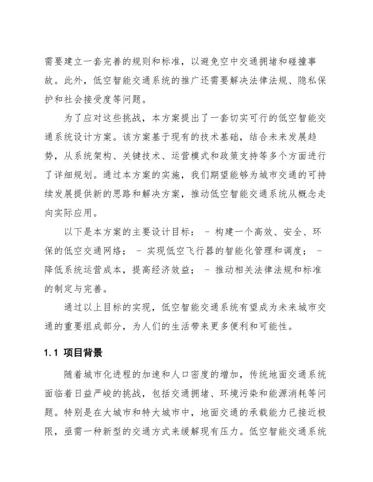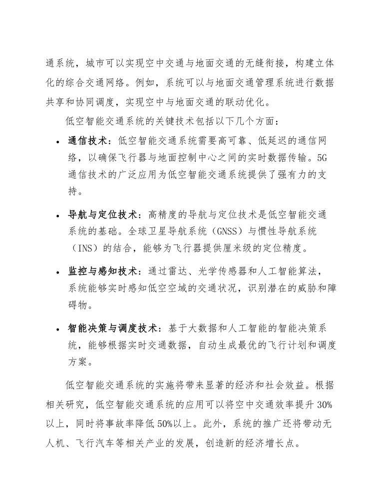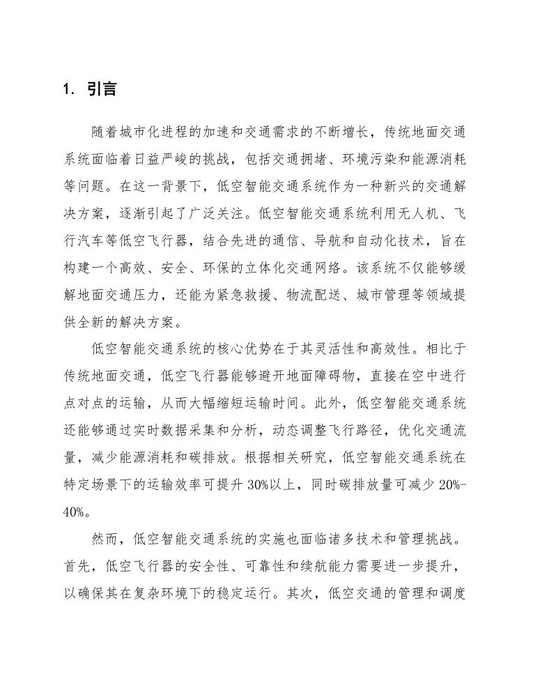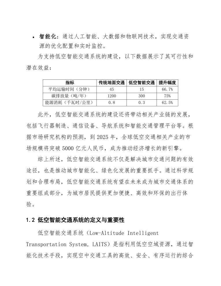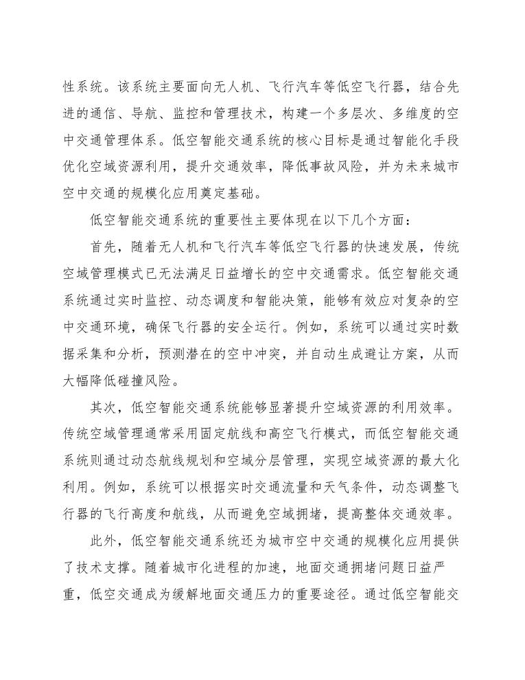 综上所述,低空智能交通系统不仅是未来空中交通发展的必然趋势,也是解决城市交通拥堵、提升交通效率的重要手段。通过技术创新和系统集成,低空智能交通系统将为人类社会的可持续发展提供强有力的支持。