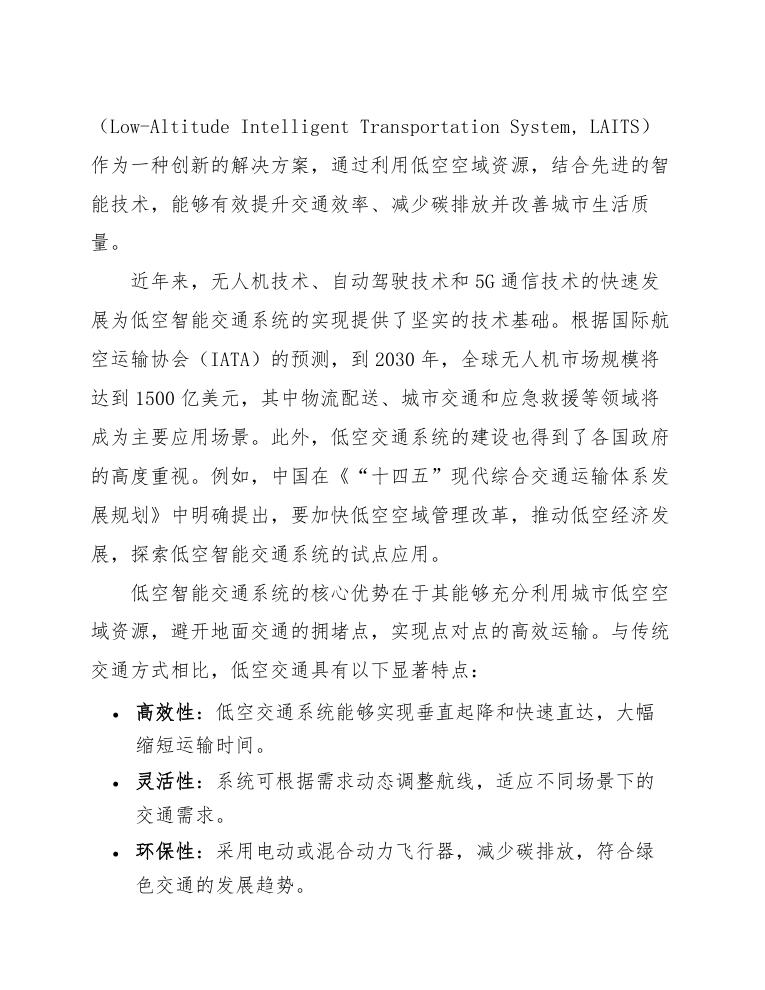 随着城市化进程的加速和人口密度的增加,传统地面交通系统面临着日益严峻的挑战,包括交通拥堵、环境污染和能源消耗等问题。特别是在大城市和特大城市中,地面交通的承载能力已接近极限,亟需一种新型的交通方式来缓解现有压力。低空智能交通系统(Low-Altitude Intelligent Transportation System, LAITS)作为一种创新的解决方案,通过利用低空空域资源,结合先进的智能技术,能够有效提升交通效率、减少碳排放并改善城市生活质量。