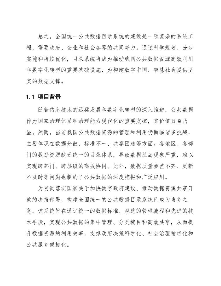 综上所述,全国统一公共数据目录系统的建设不仅是解决当前数据管理问题的迫切需求,更是推动国家数字化转型、实现高质量发展的重要支撑。通过该系统的实施,将有效提升数据资源的利用效率,促进数据要素的市场化配置,为构建数字中国奠定坚实基础。