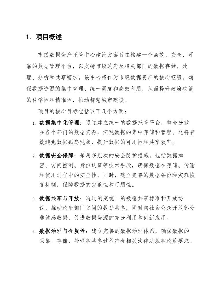 市级数据资产托管中心建设方案旨在构建一个高效、安全、可靠的数据管理平台,以支持市级政府及相关部门的数据存储、处理、分析和共享需求。该中心将作为市级数据资产的核心枢纽,确保数据资源的集中管理、统一调度和高效利用,从而提升政府决策的科学性和精准性,推动智慧城市建设。