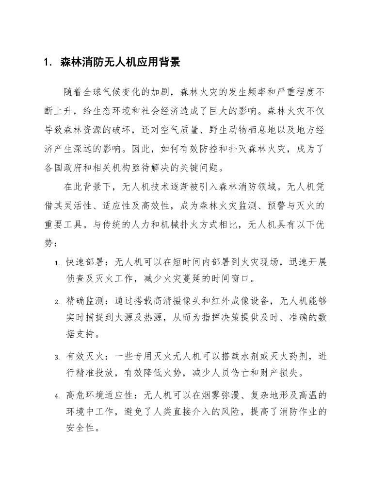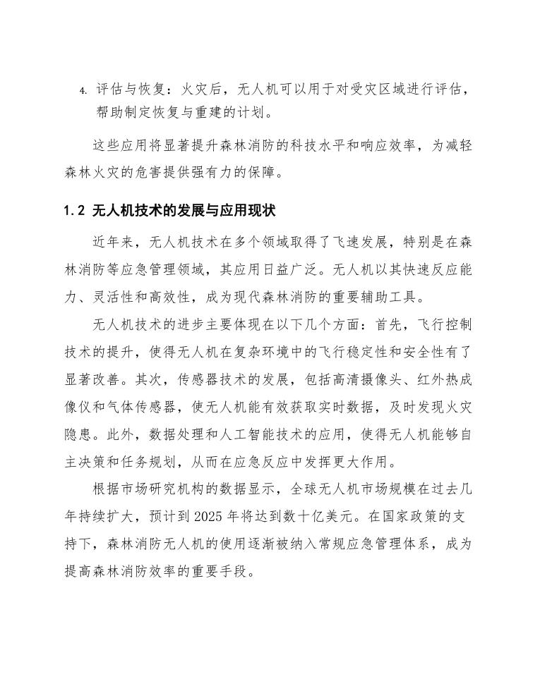 - 研发适用于森林消防的无人机设备,确保其具备长续航、高载荷、强抗风能力,并配备多光谱成像和热成像传感器。