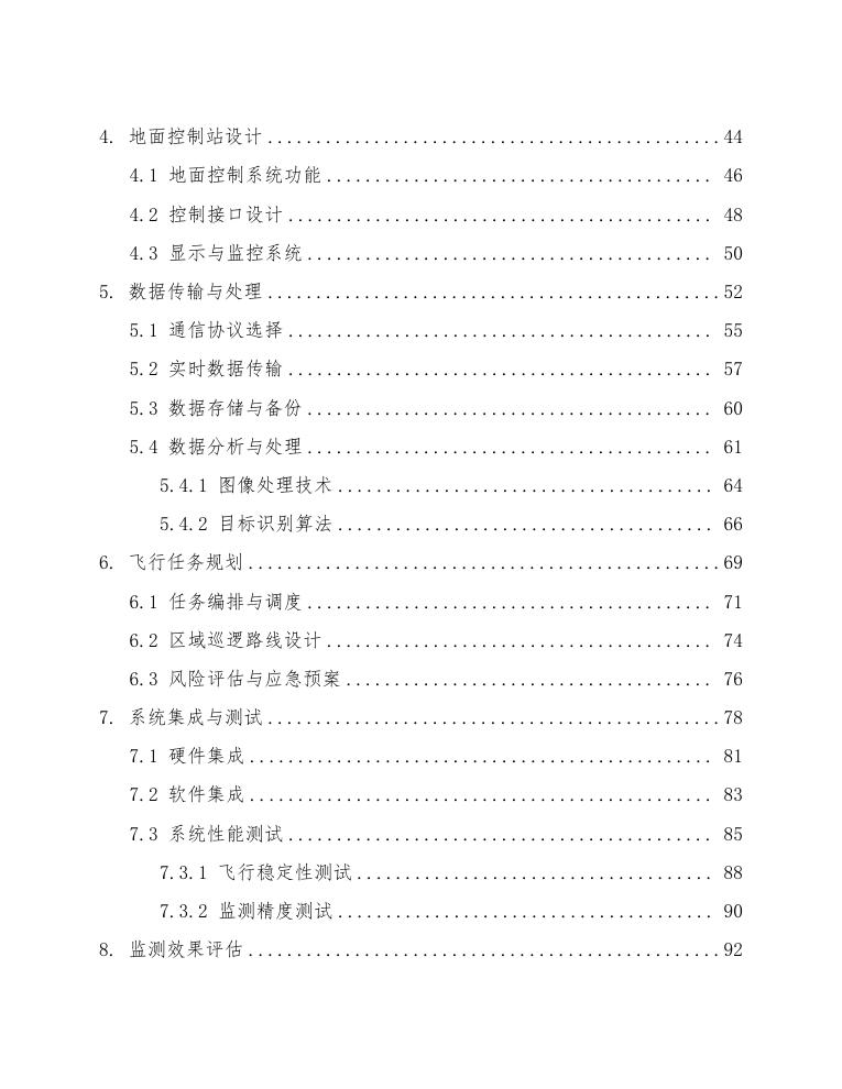 无人机系统将由多个部分组成,包括无人机平台、传感器系统、数据传输系统、控制与指挥系统以及后端数据处理系统。各部分之间紧密联系,相互配合,以实现全面的监控和数据处理。