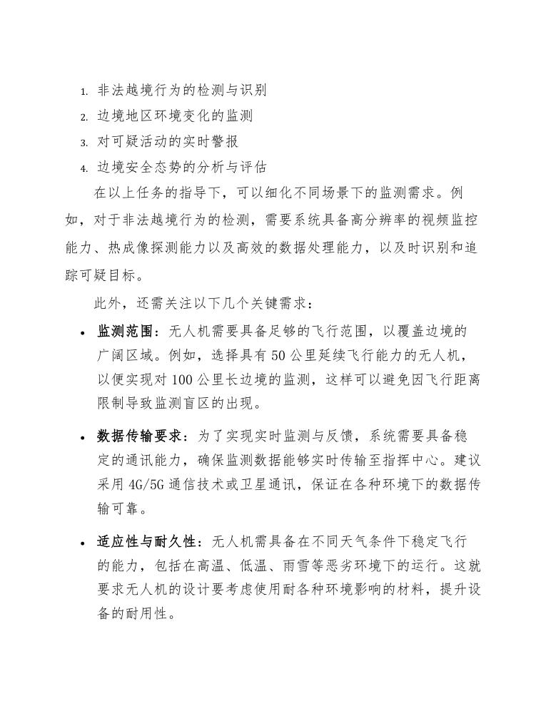 总结来说,监测需求分析的核心在于明确边境监测的具体任务、监测范围和技术要求,在此基础上配置相应的无人机系统与技术手段,以确保边境安全监测工作的高效性和及时性。这样的设计方案不仅能满足当前的监测需求,同时也具备一定的前瞻性,以应对未来可能出现的更复杂的边境安全挑战。