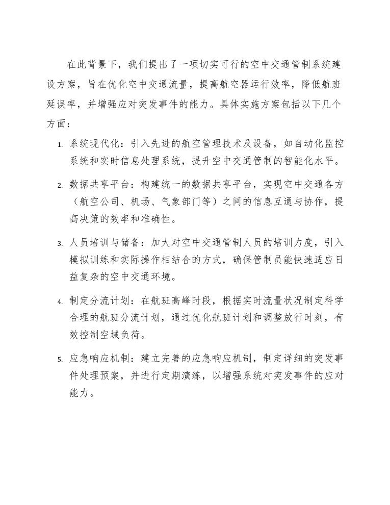 在此背景下,我们提出了一项切实可行的空中交通管制系统建设方案,旨在优化空中交通流量,提高航空器运行效率,降低航班延误率,并增强应对突发事件的能力。具体实施方案包括以下几个方面: