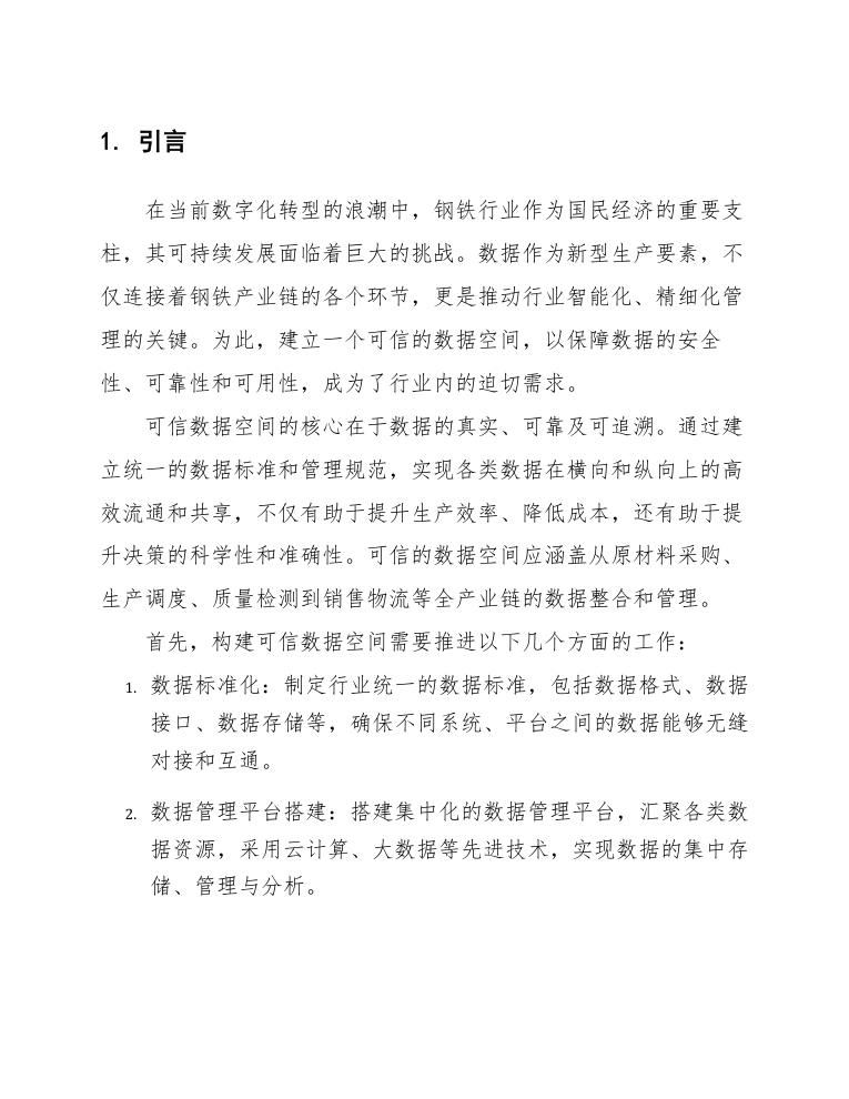 综上所述,建设钢铁可信数据空间的目标是构建一个数据真实可信、高效共享、智能决策和标准化管理的综合数据生态系统,从而为钢铁行业的转型升级提供支撑。