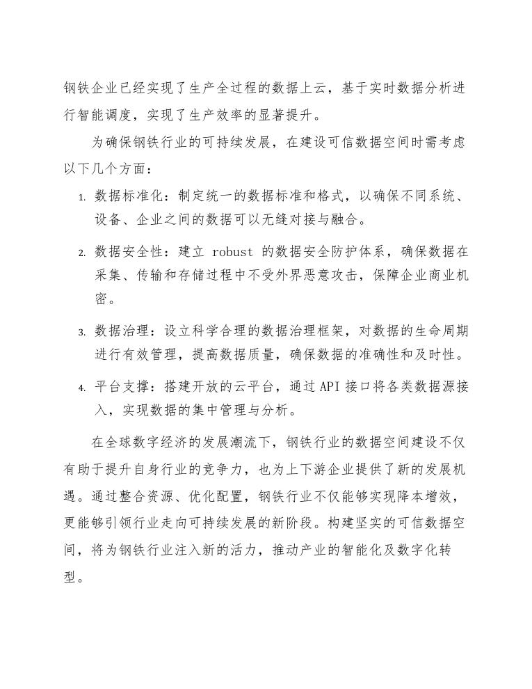 为确保钢铁行业的可持续发展,在建设可信数据空间时需考虑以下几个方面: