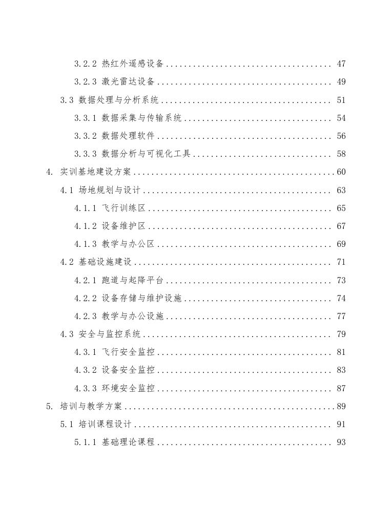 在场地需求方面,实训基地应具备足够的飞行空域和地面设施。飞行空域应满足无人机的起降、飞行和数据采集需求,同时需符合相关法律法规的要求。地面设施包括无人机停放区、设备维护区、数据处理中心、培训教室等,确保实训基地的功能完备与高效运行。