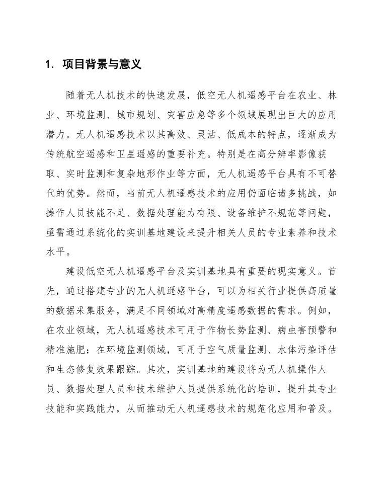 综上所述,低空无人机遥感平台及实训基地的建设不仅是技术发展的必然需求,也是推动相关行业转型升级、提升国家科技创新能力的重要举措。通过本项目的实施,将有效解决当前无人机遥感技术应用中的瓶颈问题,为相关行业提供强有力的技术支持和人才保障,助力经济社会高质量发展。
