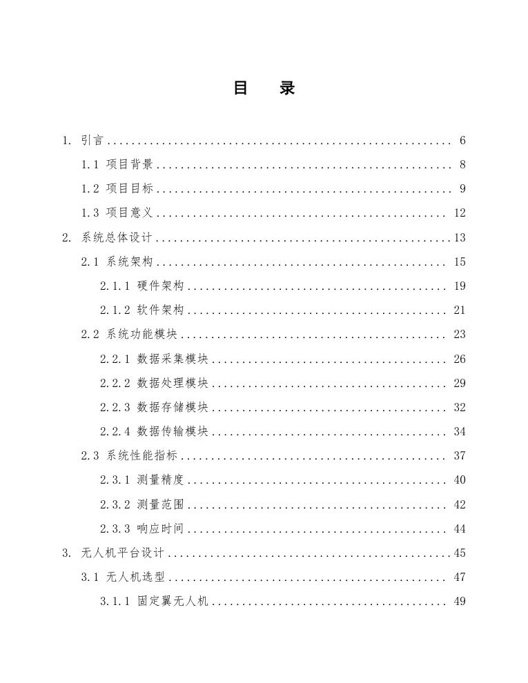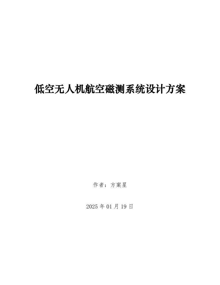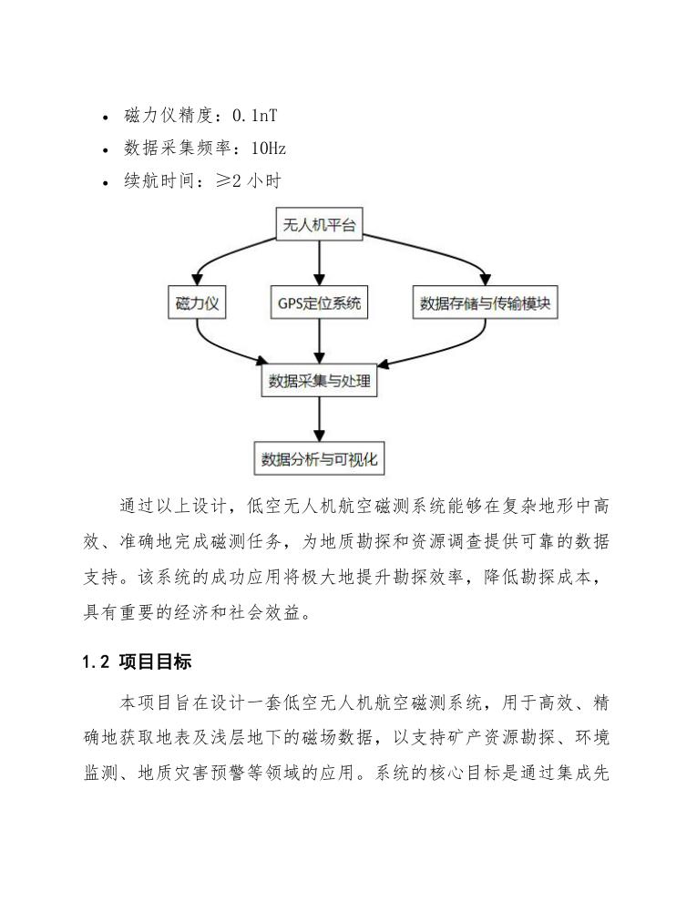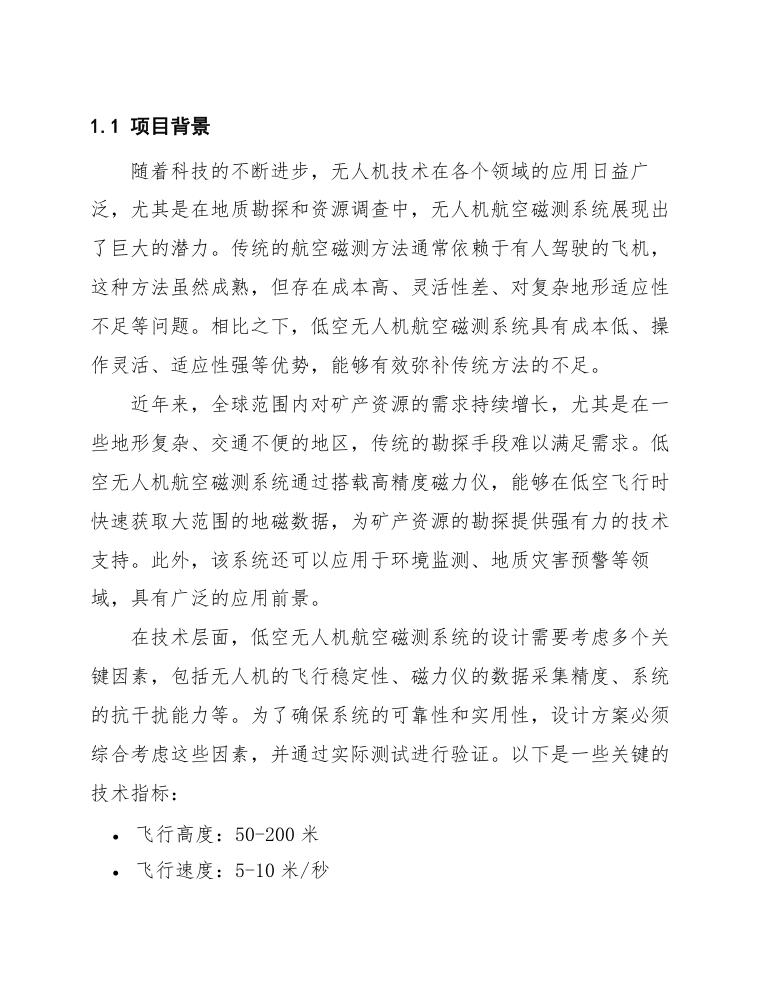 本项目旨在设计一套低空无人机航空磁测系统,用于高效、精确地获取地表及浅层地下的磁场数据,以支持矿产资源勘探、环境监测、地质灾害预警等领域的应用。系统的核心目标是通过集成先进的无人机平台、高精度磁力传感器、数据采集与处理模块,实现高分辨率、大范围的磁场测量,同时确保系统的稳定性、可靠性和易操作性。