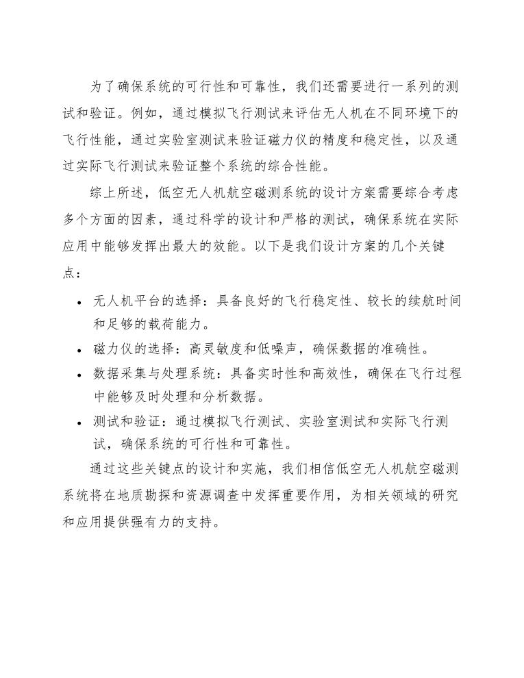 通过以上设计,低空无人机航空磁测系统能够在复杂地形中高效、准确地完成磁测任务,为地质勘探和资源调查提供可靠的数据支持。该系统的成功应用将极大地提升勘探效率,降低勘探成本,具有重要的经济和社会效益。