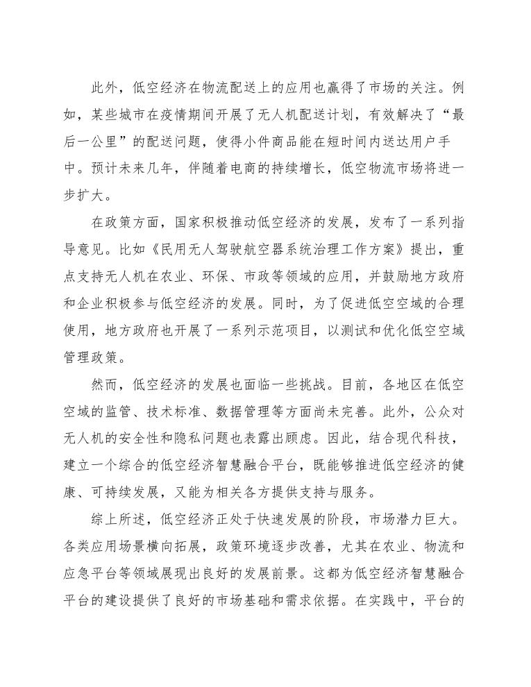 综上所述,低空经济正处于快速发展的阶段,市场潜力巨大。各类应用场景横向拓展,政策环境逐步改善,尤其在农业、物流和应急平台等领域展现出良好的发展前景。这都为低空经济智慧融合平台的建设提供了良好的市场基础和需求依据。在实践中,平台的建设应围绕市场需求,借助技术发展,逐步完善相关标准与服务,以实现经济的可持续发展。