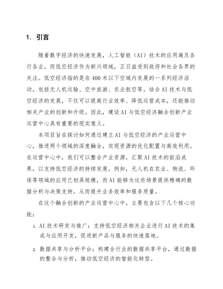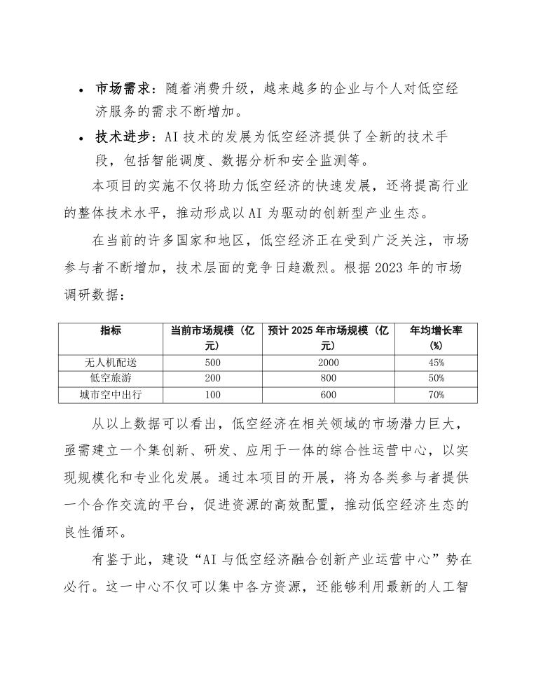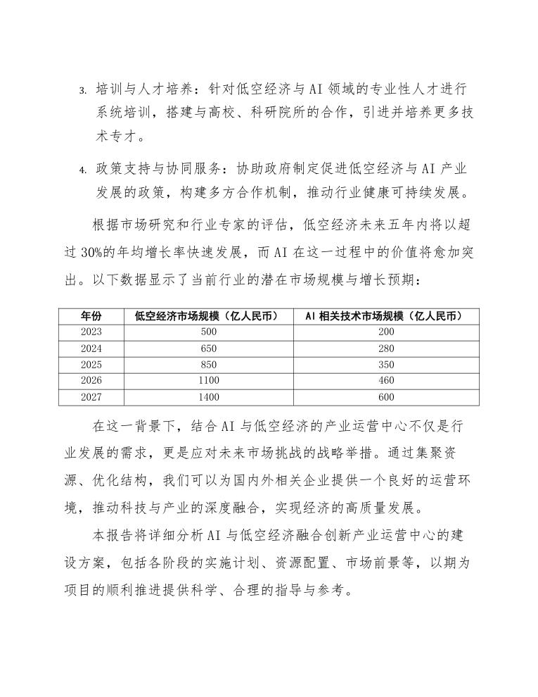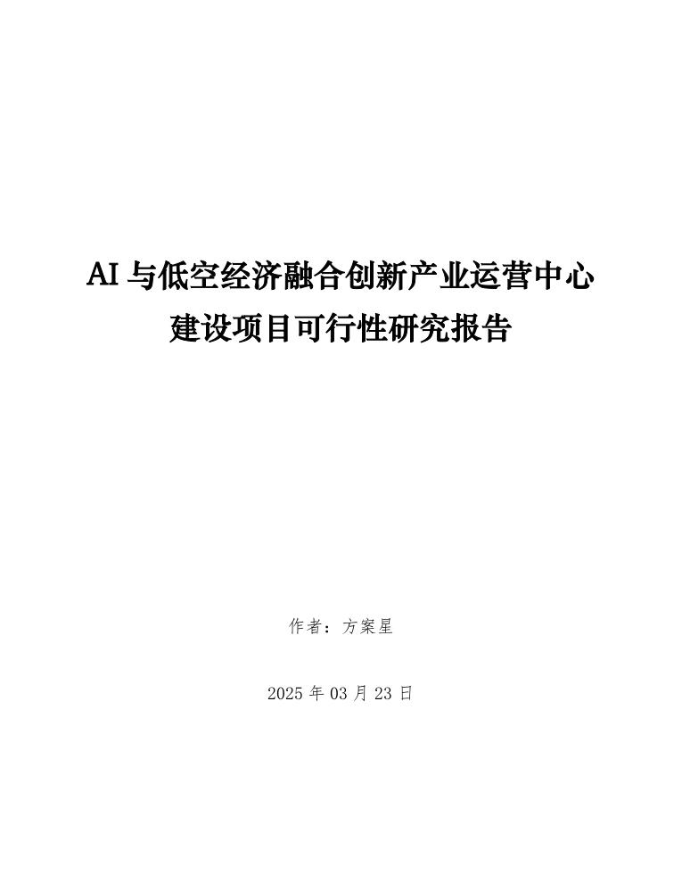 本报告将详细分析AI与低空经济融合创新产业运营中心的建设方案,包括各阶段的实施计划、资源配置、市场前景等,以期为项目的顺利推进提供科学、合理的指导与参考。