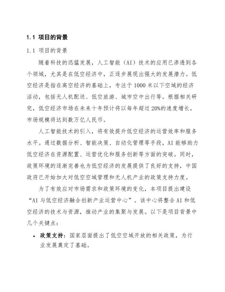 为了有效应对市场需求和政策环境的变化,本项目提出建设“AI与低空经济融合创新产业运营中心”。该中心将整合AI和低空经济的技术与资源,推动产业的集聚与发展。以下是项目背景中几个关键点: