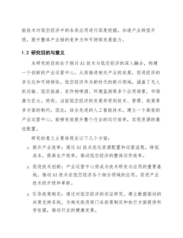 本研究的目的在于探讨AI技术与低空经济的深入融合,构建一个创新的产业运营中心,从而推进相关产业的发展,促进经济的多元化和可持续性。低空经济作为新时代的新兴领域,涵盖了无人机运输、低空旅游、农作物喷洒、环境监测等多个应用场景,市场潜力巨大。然而,当前低空经济的发展却受到技术、管理、政策等多方面的制约。因此,结合先进的人工智能技术,建立一个高效的产业运营中心,能够有效提升整个行业的运行效率,实现资源的最优配置。