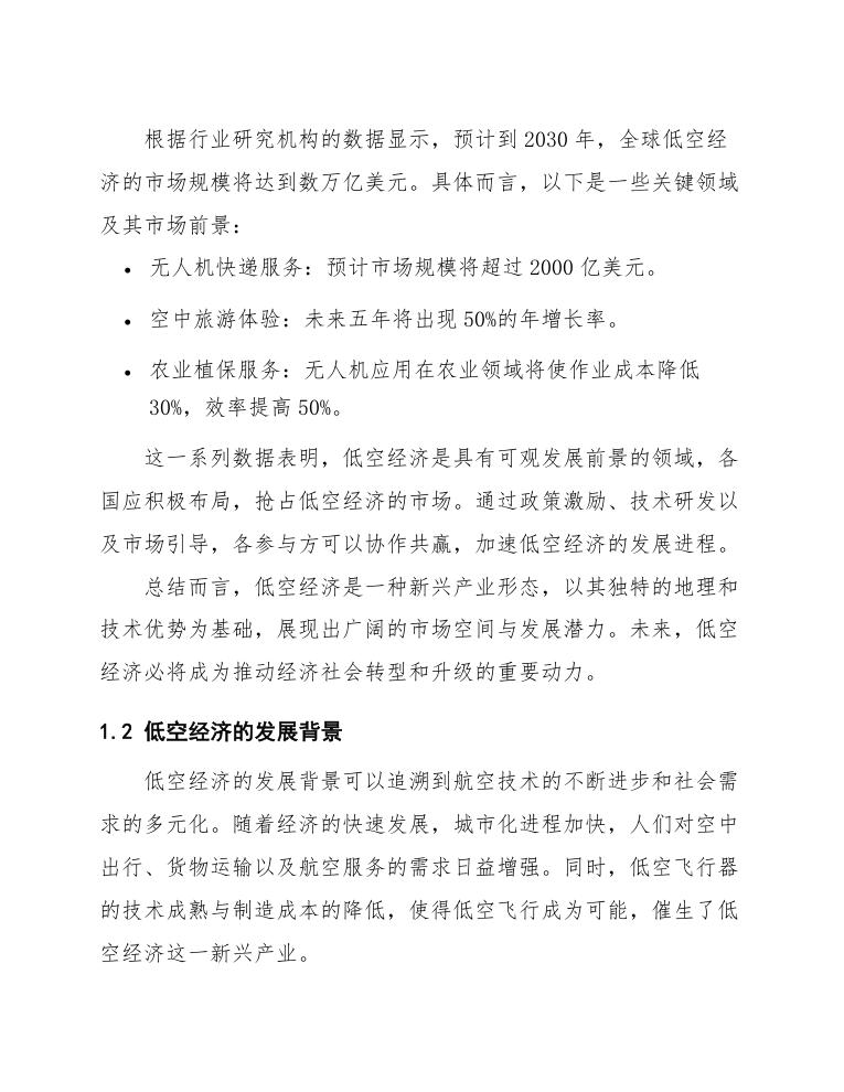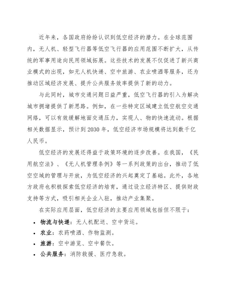 总结而言,低空经济是一种新兴产业形态,以其独特的地理和技术优势为基础,展现出广阔的市场空间与发展潜力。未来,低空经济必将成为推动经济社会转型和升级的重要动力。