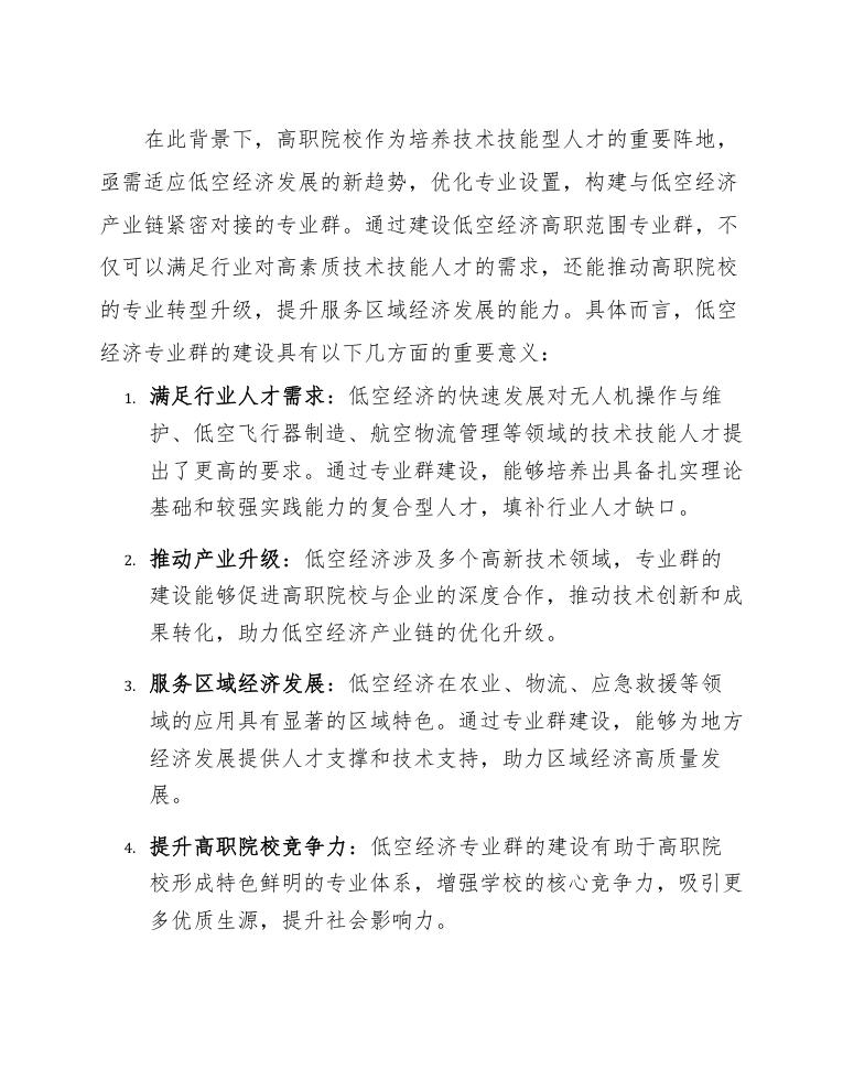 在此背景下,高职院校作为培养技术技能型人才的重要阵地,亟需适应低空经济发展的新趋势,优化专业设置,构建与低空经济产业链紧密对接的专业群。通过建设低空经济高职范围专业群,不仅可以满足行业对高素质技术技能人才的需求,还能推动高职院校的专业转型升级,提升服务区域经济发展的能力。具体而言,低空经济专业群的建设具有以下几方面的重要意义: