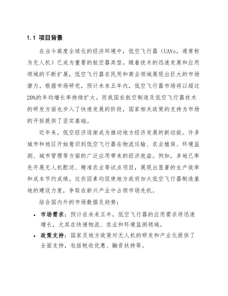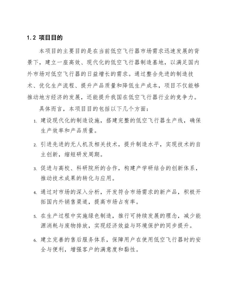 通过实现这些目的,项目将不仅仅是一个制造基地,更将成为推动低空飞行器技术发展和产业升级的核心动力源。这对于推动地方经济、促进就业、增强科技创新能力以及提升我国在国际低空飞行器市场中的地位均具有重要的现实意义。