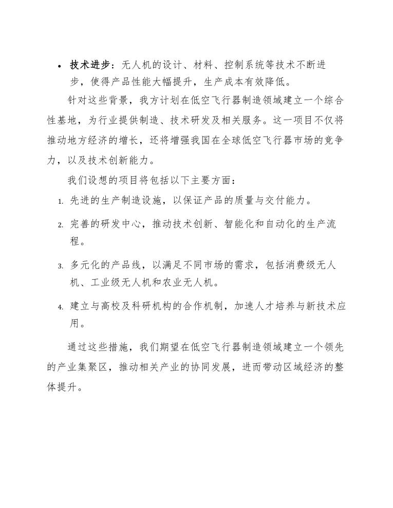 针对这些背景,我方计划在低空飞行器制造领域建立一个综合性基地,为行业提供制造、技术研发及相关服务。这一项目不仅将推动地方经济的增长,还将增强我国在全球低空飞行器市场的竞争力,以及技术创新能力。
