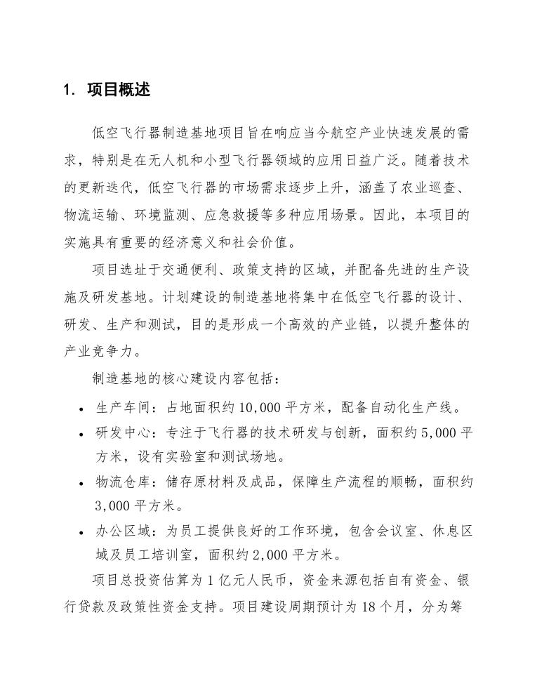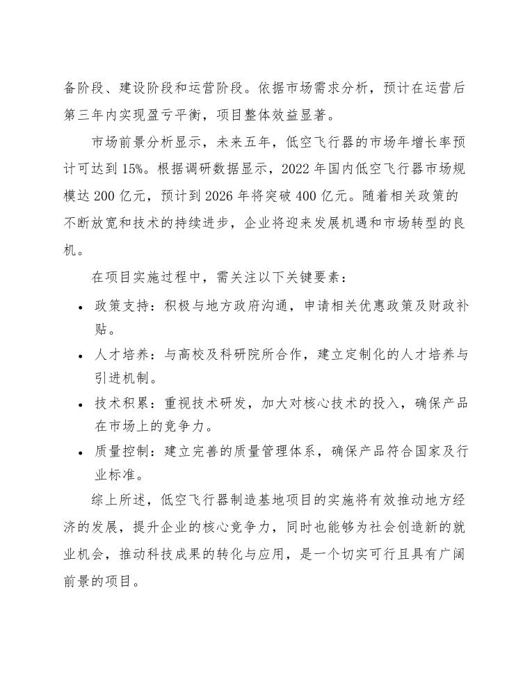 综上所述,低空飞行器制造基地项目的实施将有效推动地方经济的发展,提升企业的核心竞争力,同时也能够为社会创造新的就业机会,推动科技成果的转化与应用,是一个切实可行且具有广阔前景的项目。