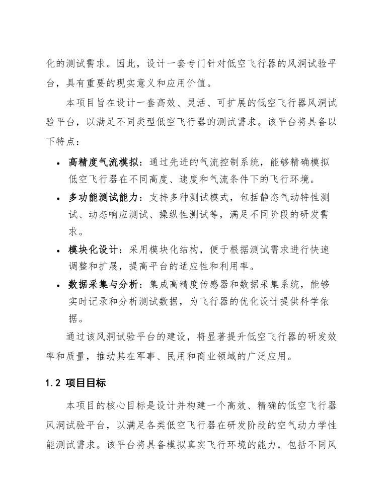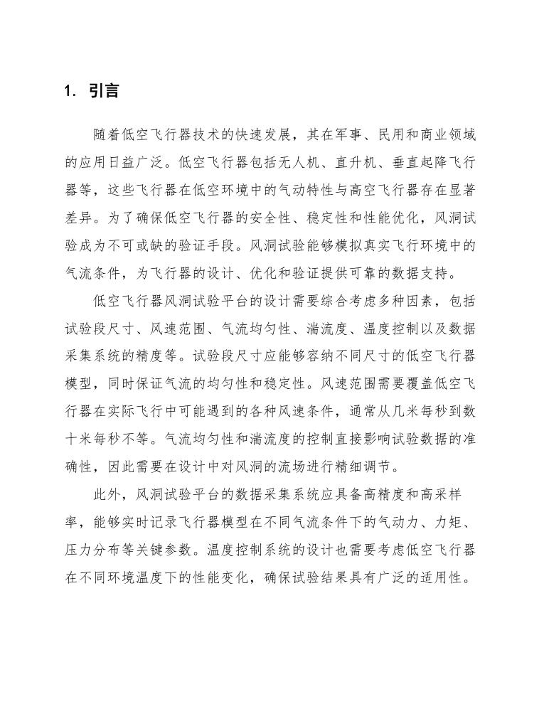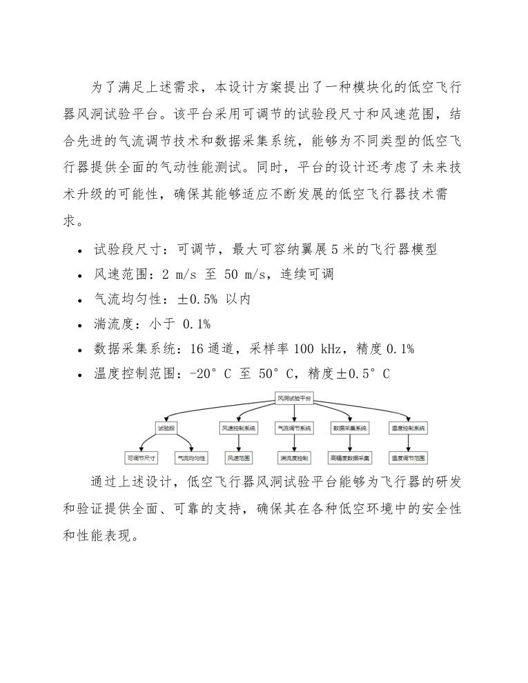 通过上述设计,风洞试验平台能够为低空飞行器的研发提供可靠的气动测试环境,确保飞行器在实际飞行中的安全性和性能。