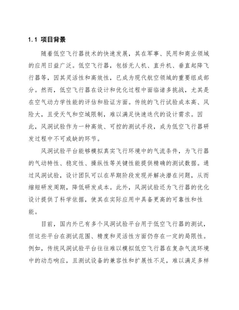 综上所述,低空飞行器风洞试验平台的建设不仅是技术发展的必然需求,也是推动低空经济高质量发展的重要基础设施。通过该平台,可以有效提升低空飞行器的整体性能,降低研发成本,促进产业链协同发展,为低空飞行器的广泛应用奠定坚实基础。