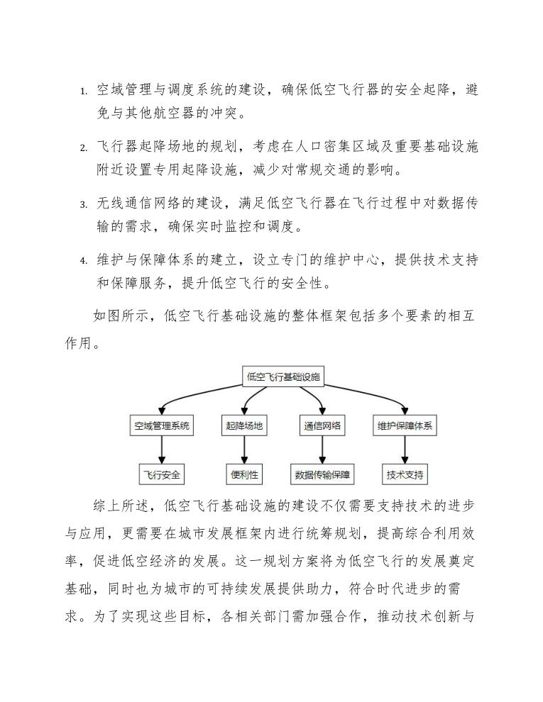 整体来看,低空飞行基础设施的规划应朝着综合化、智能化、可持续的发展方向迈进。通过建立多功能综合设施,确保各类低空飞行活动中的协调与互动,最大程度地提高安全性和运行效率。