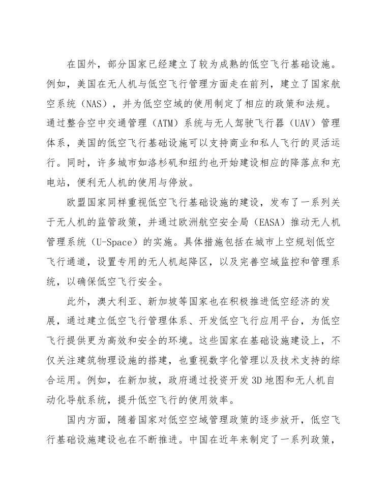 总体来看,国内外在低空飞行基础设施建设方面都在向智能化和多元化发展,通过政策支持、技术进步和实际应用场景的推动,实现对低空空域的合理利用与管理。低空飞行基础设施的建设不仅为无人机产业的发展提供了支撑,也为促进城市空中交通、物流服务等新兴业态的腾飞铺平了道路。