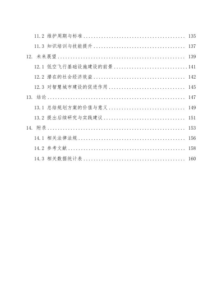 综上所述,低空飞行基础设施的建设不仅需要支持技术的进步与应用,更需要在城市发展框架内进行统筹规划,提高综合利用效率,促进低空经济的发展。这一规划方案将为低空飞行的发展奠定基础,同时也为城市的可持续发展提供助力,符合时代进步的需求。为了实现这些目标,各相关部门需加强合作,推动技术创新与政策落地,确保低空飞行基础设施建设得到经济与社会的广泛支持。
