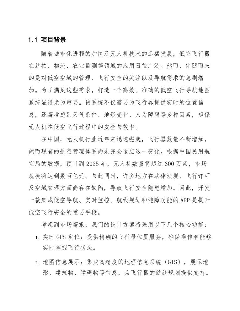 在中国,无人机行业近年来迅速崛起,飞行器数量不断增加,然而现有的航空管理体系尚未完全适应这一变化。根据中国民用航空局的数据,预计到2025年,无人机数量将超过300万架,市场规模将达到数百亿元。与此同时,许多地方在法律法规、飞行许可及空域管理方面尚存在缺陷,导致飞行安全隐患增加。因此,开发一款集成低空导航、实时监控、航线规划和避障功能的APP是提升低空飞行安全的重要手段。