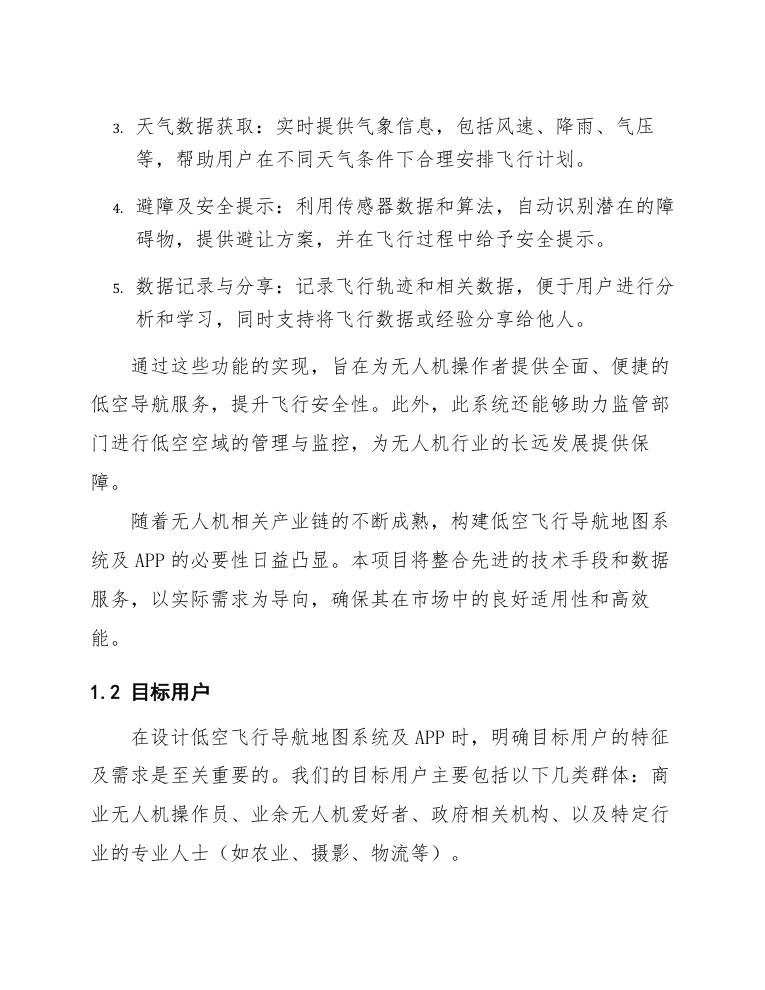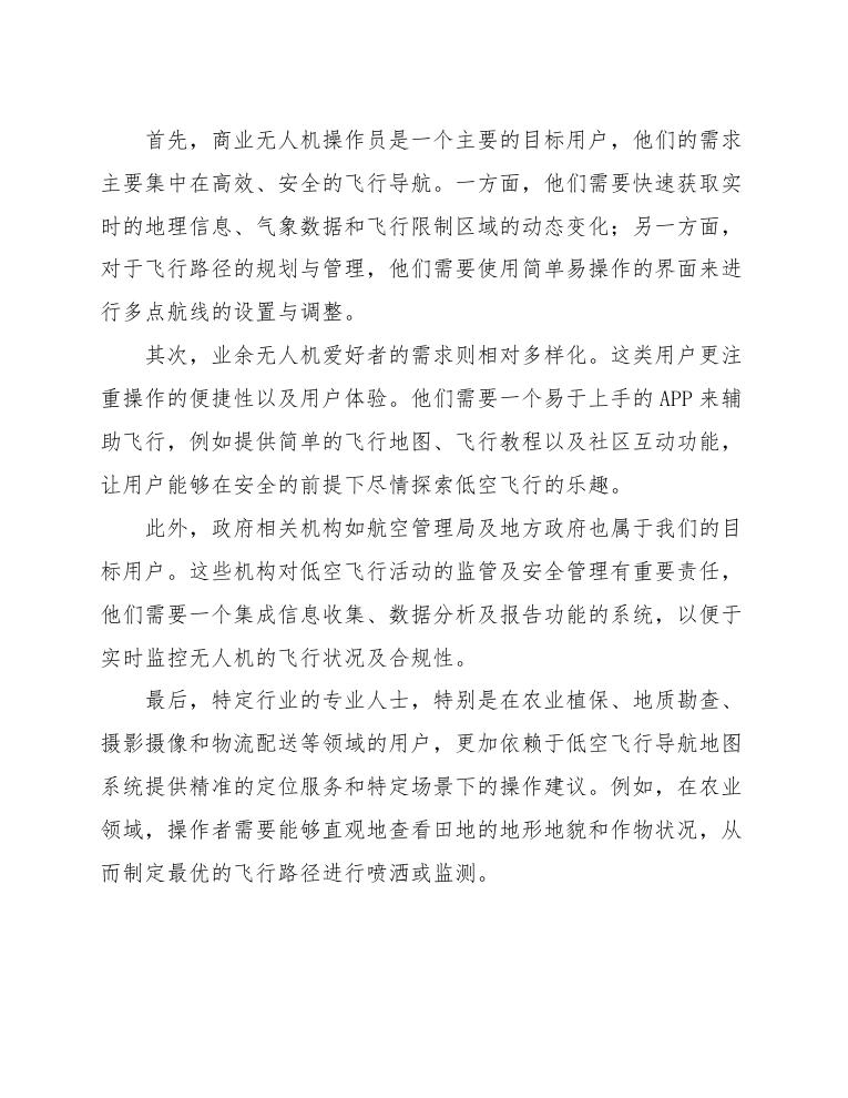 在设计低空飞行导航地图系统及APP时,明确目标用户的特征及需求是至关重要的。我们的目标用户主要包括以下几类群体:商业无人机操作员、业余无人机爱好者、政府相关机构、以及特定行业的专业人士(如农业、摄影、物流等)。