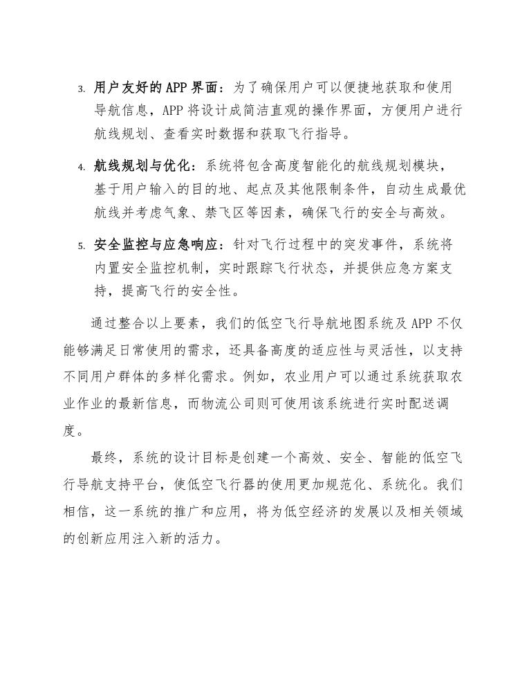 综合以上分析,针对低空飞行的需求,我们可得出设计方案中应着重解决的问题,例如开发高精度的实时导航地图,通过APP方便用户获取航线规划和实时监控,确保在提升低空飞行效率的同时,保障飞行安全性与合规性。