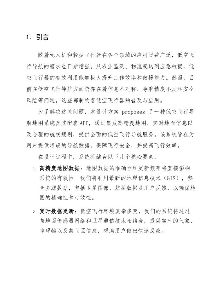 为了解决这些问题,本设计方案 proposes 了一种低空飞行导航地图系统及其配套APP,通过集成高精度地图、实时地面信息以及合理的航线规划,提供全面的低空飞行导航服务。该系统旨在为用户提供准确的导航数据,保障飞行安全,并提高飞行效率。