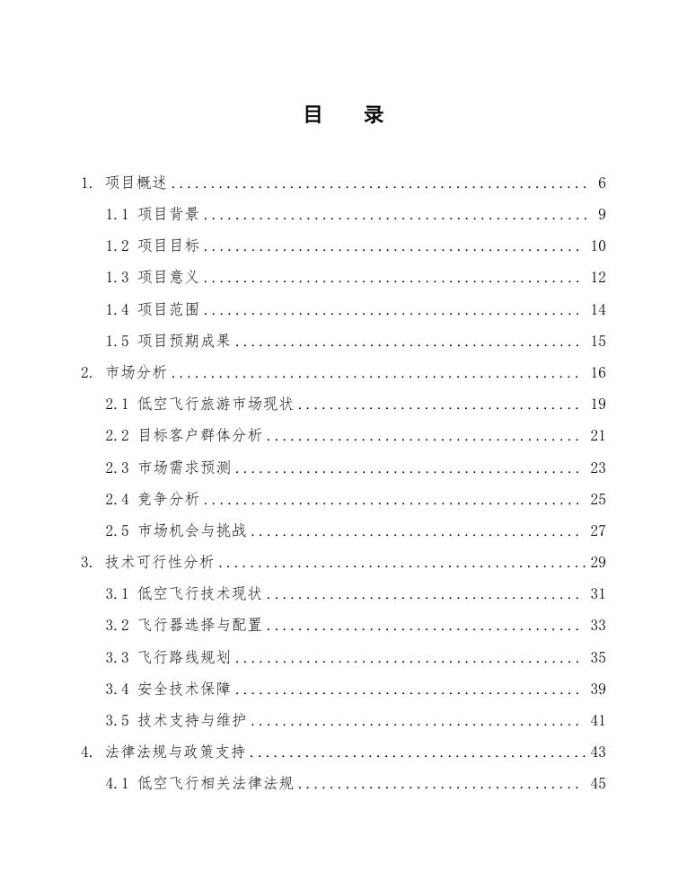 - 第三阶段:正式运营和市场推广,全面开展低空飞行旅游项目,加大市场推广力度,提升品牌知名度。
