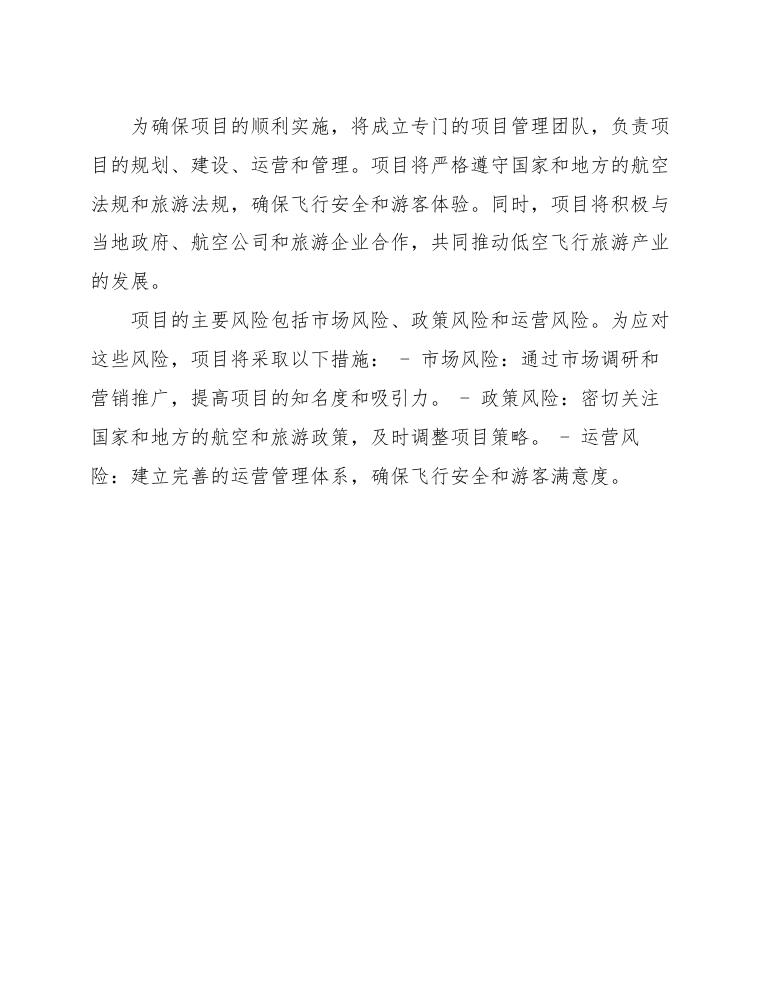 为确保项目的顺利实施,将成立专门的项目管理团队,负责项目的规划、建设、运营和管理。项目将严格遵守国家和地方的航空法规和旅游法规,确保飞行安全和游客体验。同时,项目将积极与当地政府、航空公司和旅游企业合作,共同推动低空飞行旅游产业的发展。