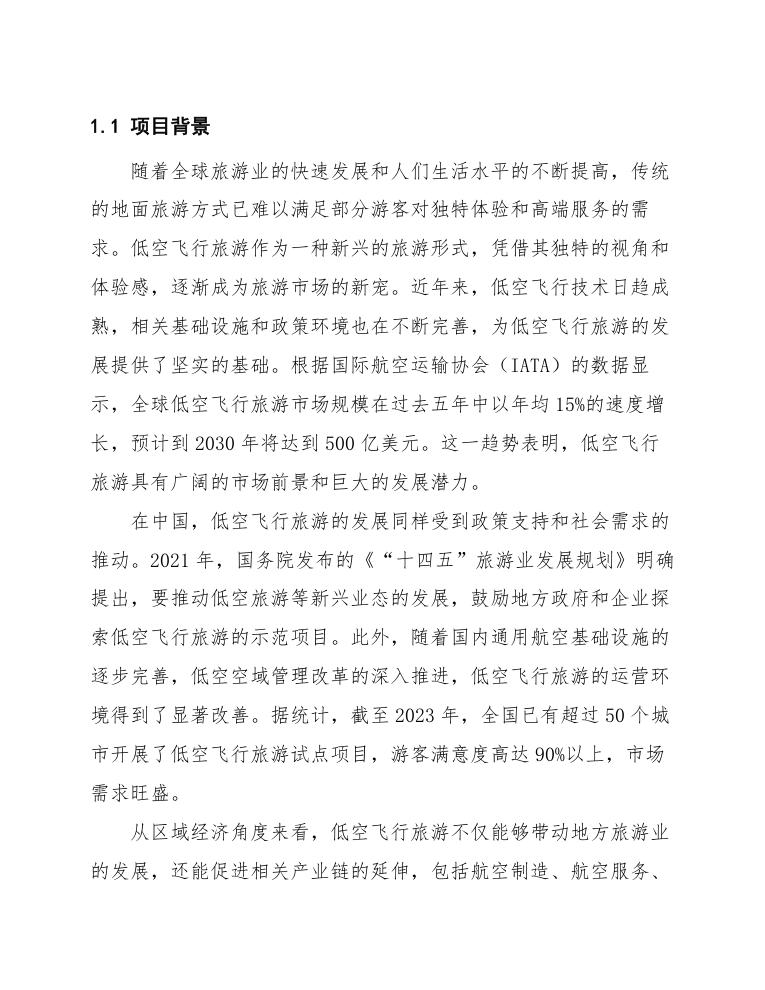 综上所述,低空飞行旅游市场具有广阔的发展前景和巨大的市场潜力。通过精准的市场定位、差异化的产品设计和完善的服务体系,低空飞行旅游示范基地有望在未来的市场竞争中占据有利地位,成为推动区域旅游经济发展的重要引擎。