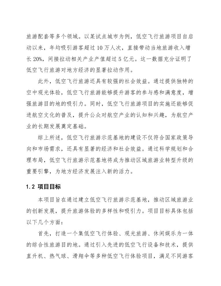 其次,提升区域旅游经济的整体水平。通过低空飞行旅游项目的引入,预计每年吸引游客数量将增加20%以上,旅游收入增长30%以上。项目还将带动周边餐饮、住宿、交通等相关产业的发展,创造更多的就业机会,促进区域经济的可持续发展。