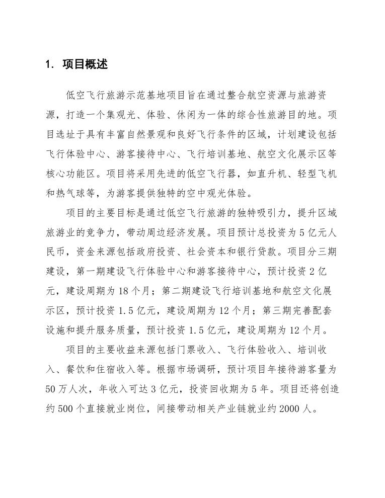 项目的主要目标是通过低空飞行旅游的独特吸引力,提升区域旅游业的竞争力,带动周边经济发展。项目预计总投资为5亿元人民币,资金来源包括政府投资、社会资本和银行贷款。项目分三期建设,第一期建设飞行体验中心和游客接待中心,预计投资2亿元,建设周期为18个月;第二期建设飞行培训基地和航空文化展示区,预计投资1.5亿元,建设周期为12个月;第三期完善配套设施和提升服务质量,预计投资1.5亿元,建设周期为12个月。