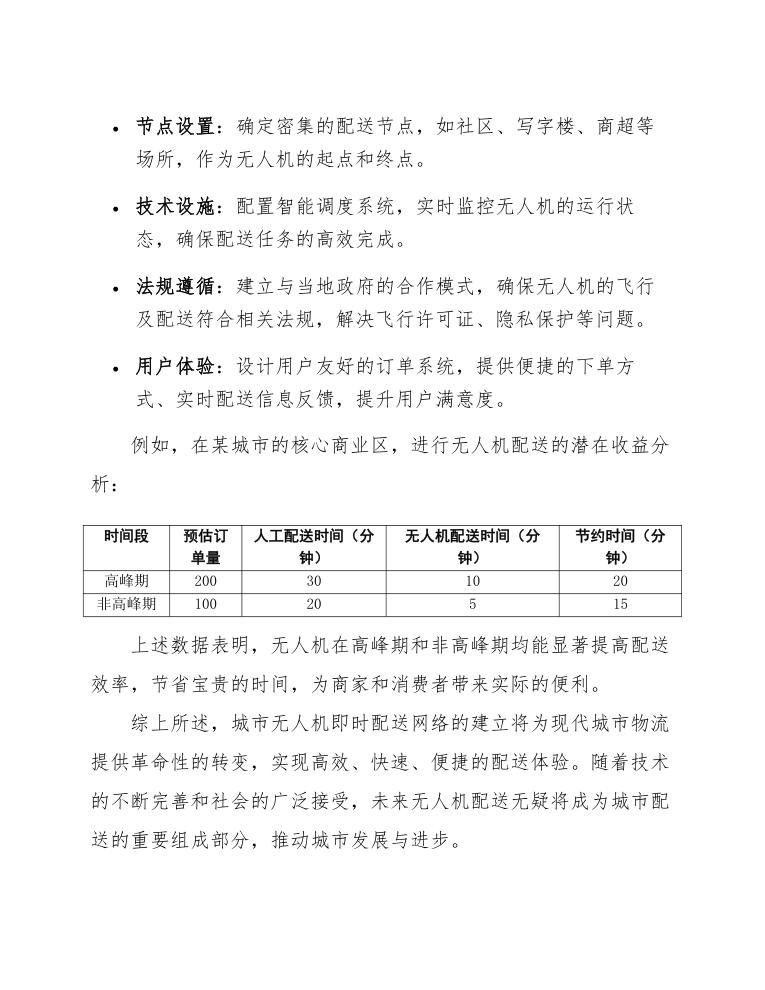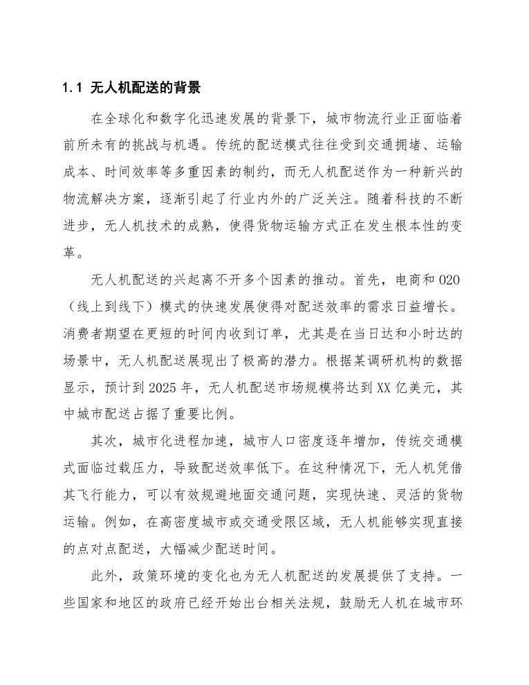 综合上述分析,城市无人机即时配送市场正处于快速发展的阶段,企业需顺应市场变化,通过创新和服务提升,满足消费者日益增长的配送需求,实现商业价值。