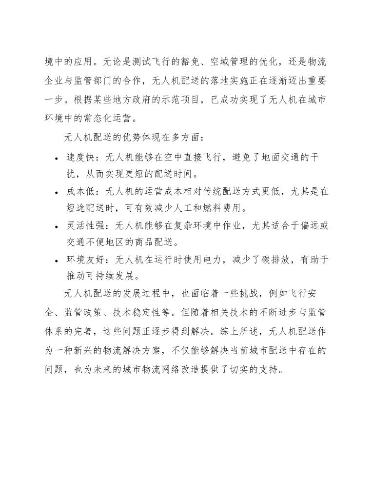 完善法规政策:应当制定相关法律法规,为无人机的飞行和配送创建安全、高效的环境。